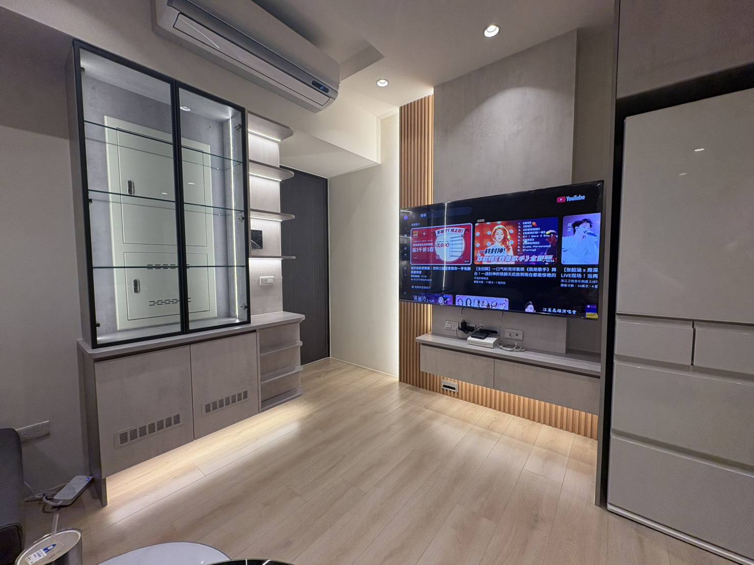 本案以客廳主要視覺牆面為核心,透過系統電視櫃與展示櫃的整合配置,讓收納與展示功能同時存在而不顯雜亂,櫃體配置依照實際觀看距離與使用習慣進行安排,使電視區域成為空間的視覺重心,同時保留足夠的收納容量,讓日常物品能夠妥善歸位。