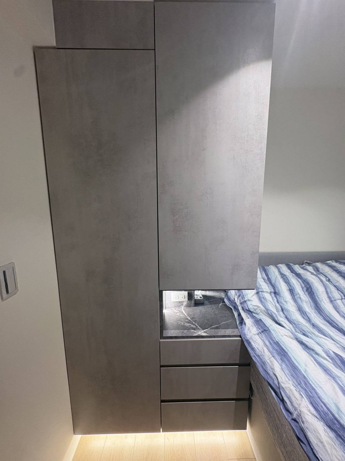 本案以臥室收納需求為主要出發點,透過系統衣櫃與床邊收納的整合配置,讓衣物、日常用品與睡眠空間之間取得良好平衡,櫃體配置依照實際使用動線規劃,使起居與收納不互相干擾,提升臥室整體的使用便利性。