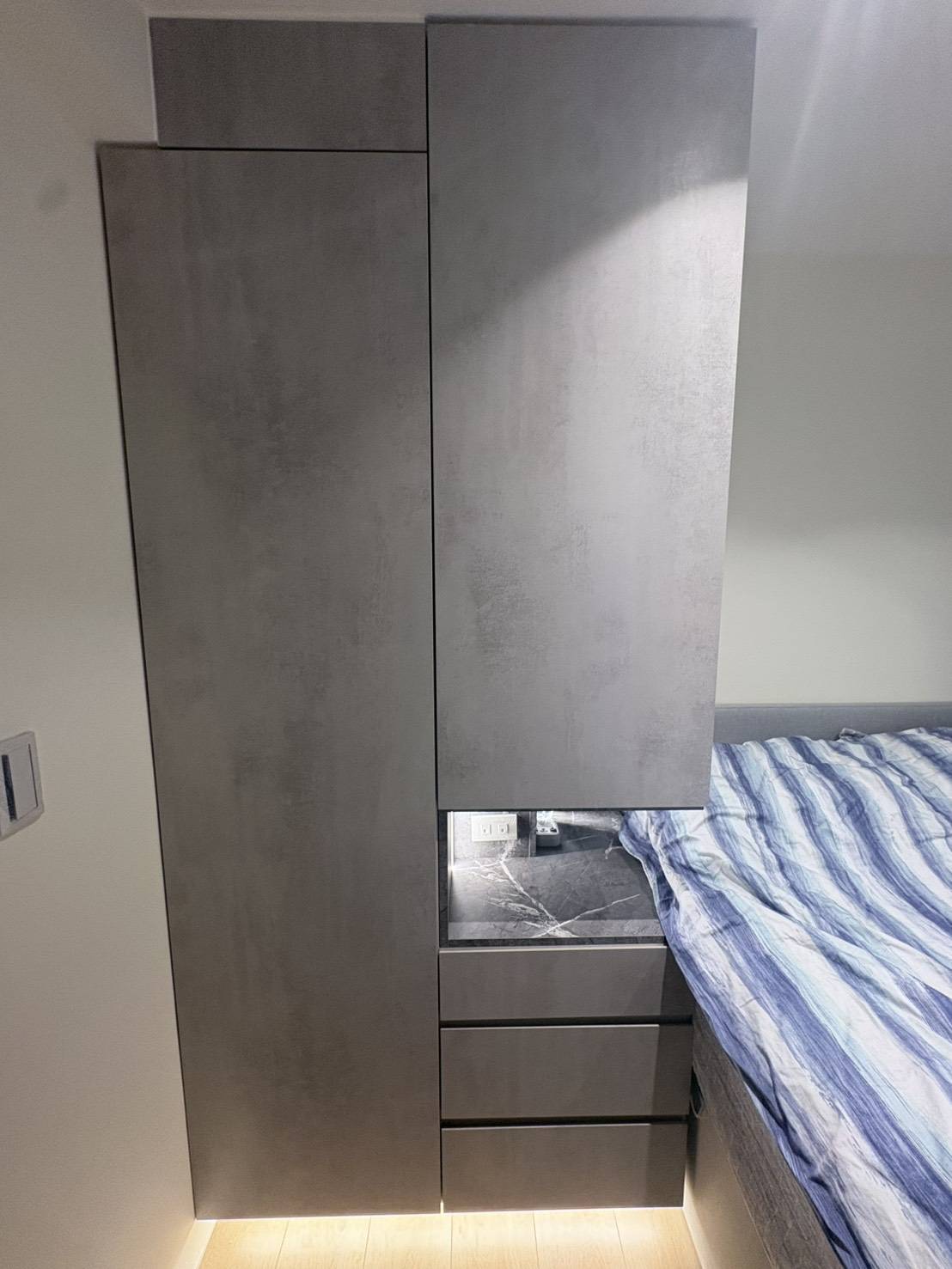 本案以臥室收納需求為主要出發點,透過系統衣櫃與床邊收納的整合配置,讓衣物、日常用品與睡眠空間之間取得良好平衡,櫃體配置依照實際使用動線規劃,使起居與收納不互相干擾,提升臥室整體的使用便利性。