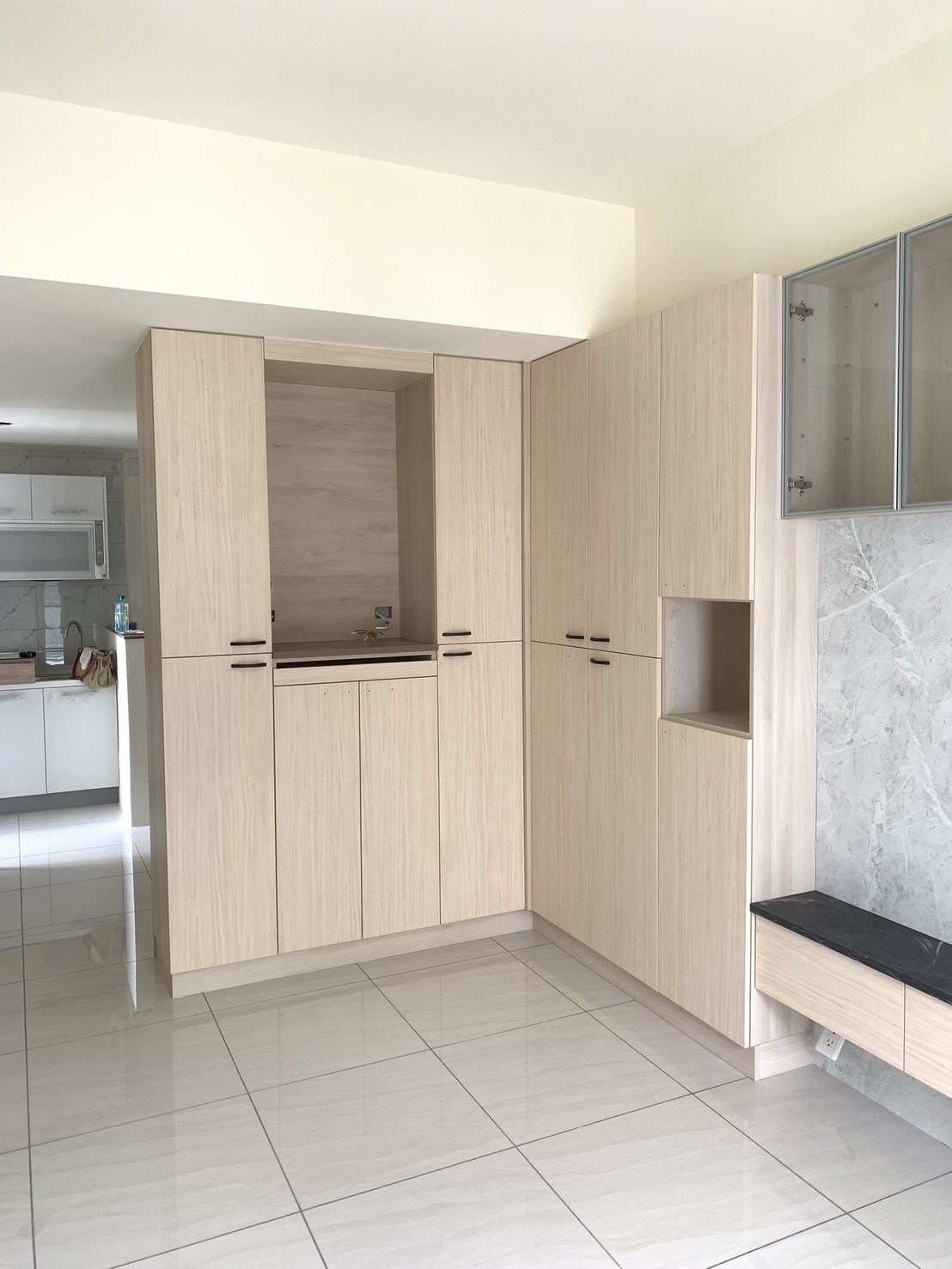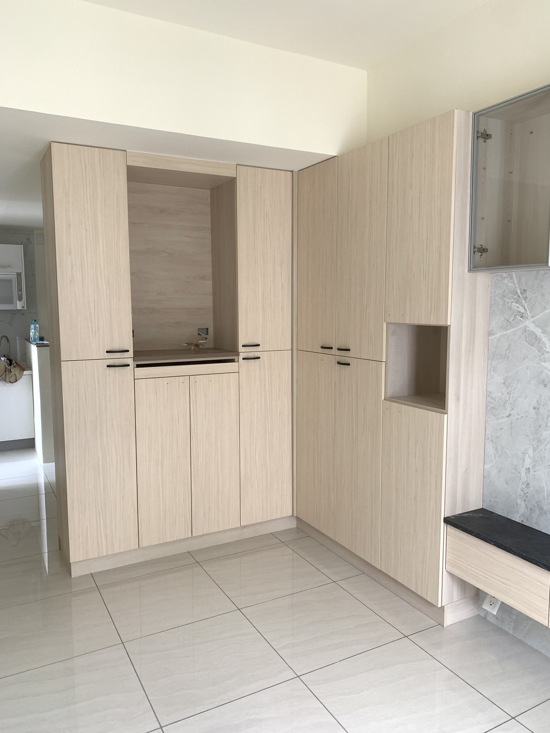 本案以多功能使用為核心,將系統櫃與書桌結合,滿足收納、工作與日常使用需求,櫃體配置依照實際操作順序安排,使物品取用更加直覺,避免空間被單一功能侷限,提升整體使用彈性。